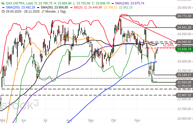 Der DAX konnte seine Rally am Freitag bis auf ein im späten Geschäft verbuchtes 9-Tages-Hoch bei 23.884 Punkten fortsetzen. Am dort befindlichen 61,8%-Fibonacci-Retracement der vorausgegangenen Abwärtswelle setzten Gewinnmitnahmen ein.