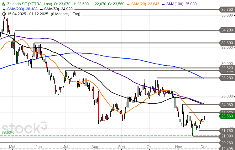 Die Aktie des Online-Modehändlers Zalando (WKN: ZAL111) hatte unterhalb des im Jahr 2021 bei 105,90 EUR markierten Allzeithochs eine große bearishe Trendwende vollzogen. Der Abschwung schickte die Notierung bis auf ein im Januar vergangenen Jahres verzeichnetes Allzeittief bei 15,95 EUR. Im Rahmen des dort gestarteten Aufwärtstrends konnte der Wert bis auf ein im Februar dieses Jahres bei 40,08 EUR verbuchtes 2-Jahres-Hoch vorstoßen. Hiervon ausgehend befindet er sich in einer ausgeprägten Abwärtskorrektur. Dabei erreichte die Preiskurve zuletzt eine bedeutende Supportzone, die sich aus mehreren Reaktionstiefs des Sommers 2024 sowie dem 78,6%-Fibonacci-Retracement (21,11 EUR) ergibt. Darüber zeigt der Anteilsschein nun eine Stabilisierung. Nächste Widerstände und potenzielle Erholungsziele liegen bei 23,97 EUR und 24,93-25,09 EUR. Darüber käme es zu einer Aufhellung auch des mittelfristigen Chartbildes. Zur Komplettierung eines übergeordneten Bodens bedarf es der nachhaltigen Überwindung der Widerstandszone bei aktuell 28,18/28,28 EUR, wo sich derzeit auch die fallende 200-Tage-Linie befindet. Eine Verletzung der Supportzone bei 20,77-21,75 EUR per Tagesschluss würde derweil das bullishe Szenario zerstören und eine unmittelbare Ausdehnung des mittelfristigen Abwärtstrends in Richtung 20,26 EUR und eventuell 19,50 EUR nahelegen.