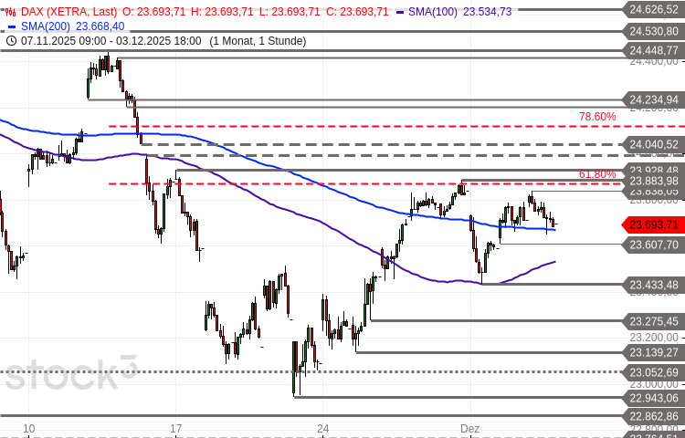 Das kurzfristige technische Bias bleibt neutral. Der Index wartet nach der jüngsten Erholungsrally vom Korrekturtief auf neue Impulse. Nächste Widerstände befinden sich heute bei 23.790 Punkten und 23.838 Punkten. Oberhalb der Barriere bei 23.866-23.884 Punkten würde die kurzfristig kritische Widerstandszone 23.928-24.041 Punkte in den Fokus rücken. Ein mögliches Ansteuern der genannten Hürden bleibt für heute auf der Agenda, solange der aktuelle Support bei 23.646-23.668 Punkten nicht per Stundenschluss unterboten wird. Weitere Auffangbereiche liegen bei 23.608/23.610 Punkten und 23.512/23.535 Punkten.
