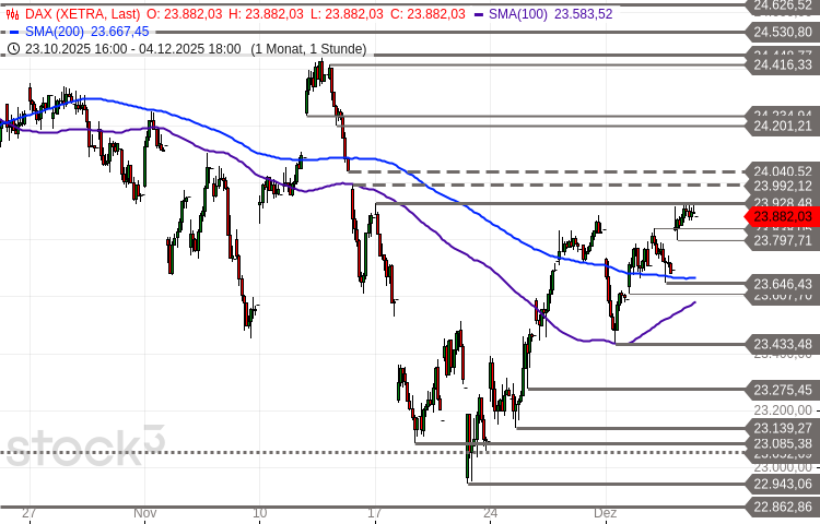 Der Index testet nun die kritische Widerstandszone 23.928-24.041 Punkte, wo sich unter anderen die gleitenden Durchschnittslinien der vergangenen 50 und 100 Tage, sowie die Abwärtslücke vom 14. November befinden. Es bleibt abzuwarten, ob ein nachhaltiger Ausbruch darüber per Tagesschluss gelingt. Im Erfolgsfall würden fortgesetzte Kursavancen in Richtung zunächst 24.088/24.121 Punkte und 24.201/24.235 Punkte möglich. Mit Blick auf die Unterseite würde ein Rutsch unter den aktuellen Supportbereich 23.797/23.838 Punkte für einen nachfolgenden Test der bedeutsameren Unterstützungszone 23.646-23.715 Punkte sprechen. Deren Verletzung per Stundenschluss würde ein deutliches Warnsignal für die bullishe Perspektive im kurzfristigen Zeitfenster darstellen.