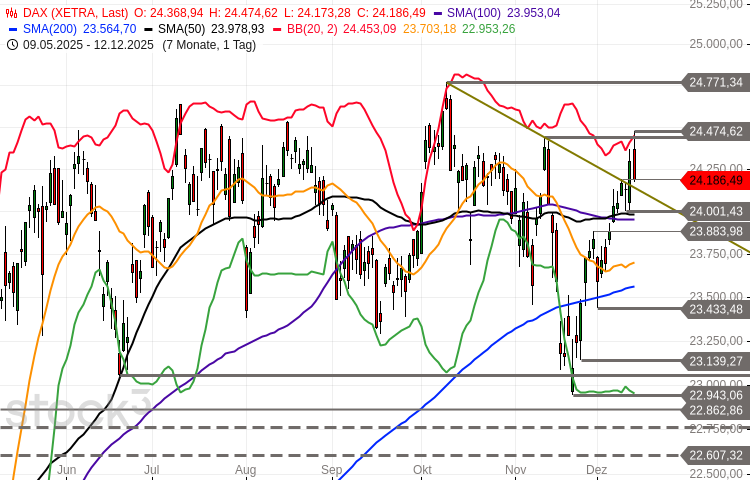 Der Aufwärtstrend vom Korrekturtief im November bei 22.943 Punkten bleibt intakt. Das Bild im übergeordneten Kontext gestaltet sich derweil aufgrund der seit Mai intakten Schiebezone weiterhin neutral. Nächste Widerstände und potenzielle Rallyziele liegen bei 24.401 Punkten, 24.441-24.475 Punkten, 24.531 Punkten, 24.627 Punkten, 24.691 Punkten und 24.771 Punkten (Rekordhoch vom Oktober). Die nächsten Unterstützungen befinden sich bei 24.173-24.193 Punkten, 24.140 Punkten und 23.953-24.028 Punkten. Darunter käme es zu einer leichten Eintrübung des kurzfristigen Chartbildes.