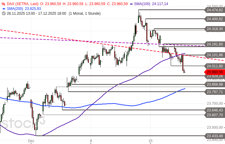 Der DAX setzte gestern nach einer freundlichen Eröffnung seinen am 12. Dezember gestarteten Abwärtstrend fort und rutschte bis zum späten Handel auf ein 8-Tages-Tief bei 23.949 Punkten.