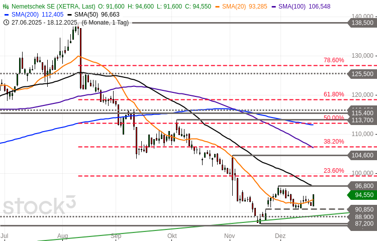 Die Nemetschek-Aktie (WKN: 645290) hatte im August dieses Jahres ein Rekordhoch bei 138,50 EUR verbucht und etablierte anschließend einen weiterhin intakten mittelfristige Abwärtstrend. Die Notierung markierte dabei im November im Bereich eines übergeordnet bedeutsamen Unterstützungsbündels ein Verlaufstief bei 87,20 EUR. Nach einer schwungvollen ersten Erholungswelle und einem nachfolgenden Rücksetzer stehen die Aussichten für eine weitere zeitnahe Aufwärtswelle gut, solange der Support bei 90,64-91,60 EUR nicht verletzt wird. Der Anteilsschein formte gestern begleitet von hohem Volumen eine lange bullishe Tageskerze. Mögliche nächste Barrieren und Erholungsziele liegen bei 96,25-96,80 EUR und 99,31-100,30 EUR. Darüber (Tagesschlusskursbasis) könnten sich der Aufschwung in Richtung 104,60-106,98 EUR ausdehnen. Unterhalb von 90,64 EUR entstünden derweil Abwärtsrisiken in Richtung zunächst 88,90/89,30 EUR und 86,60/87,20 EUR. Darunter käme es zu einer deutlichen Eintrübung des übergeordneten Chartbildes und es wäre ein mittelfristiger Rutsch in Richtung 79,30-80,10 EUR einzuplanen.