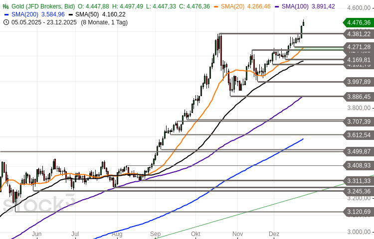 Der Goldpreis weist in allen Zeitebenen einen intakten Aufwärtstrend auf. Seit Jahresbeginn zog er bereits um 70 % an und ist auf dem Weg zur besten Jahresperformance seit dem Jahr 1979. Das Edelmetall hatte nach dem Markieren eines Rekordhochs bei 4.381 USD im Oktober eine ausgeprägte Verschnaufpause oberhalb der steigenden 50-Tage-Linie durchlaufen. Im gestrigen Handel gelang schließlich der Ausbruch auf der Oberseite. Mit den Anschlusskäufen im heutigen asiatischen Handel verbucht die Preiskurve das 50. Rekordhoch des Jahres und nähert sich der nächsten Zielregion 4.516/4.570 USD an. Darüber wäre eine unmittelbare Ausdehnung in Richtung 4.687 USD und eventuell 4.876 USD vorstellbar. Die Saisonalität liefert derzeit deutlichen Rückenwind. Laut Seasonax konnte die Notierung in den vergangenen zehn Jahren neun Mal im Zeitraum vom 23. Dezember bis zum 13. April Zugewinne verbuchen. Die durchschnittliche Rendite betrug 10,72 % (Median: +14,03 %). Mit Blick auf die Unterseite bleiben die Bullen in einer starken Position solange der Support bei 4.245-4.271 USD verteidigt werden kann.