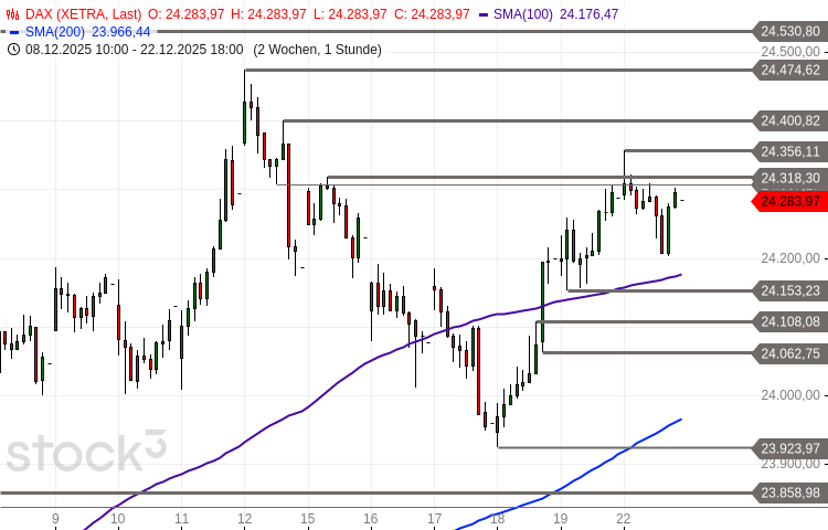 Der auf Tagesbasis geformte Long-Legged-Doji signalisiert ein Tauziehen zwischen Bullen und Bären auf dem aktuellen Kursniveau. Die kurzfristige Ausgangslage ist zur heutigen Eröffnung neutral. Ein Anstieg über die beiden Hürden bei 24.307-24.318 Punkten und 24.356/24.357 Punkten ist zur Erzeugung eines bullishen Signals mit Zielrichtung 24.401-24.475 Punkte erforderlich. Darüber würde das Rekordhoch bei 24.771 Punkten wieder in den Fokus rücken mit Zwischenetappen bei 24.531 Punkten, 24.627 Punkten und 24.691 Punkten. Auf der Unterseite ist der Support bei 24.153-24.177 Punkten relevant. Ein Stundenschluss darunter würde ein Schwächesignal senden und unmittelbare Abwärtsrisiken in Richtung 24.108 Punkte, 24.063 Punkte und 23.924-23.978 Punkte mit sich bringen.