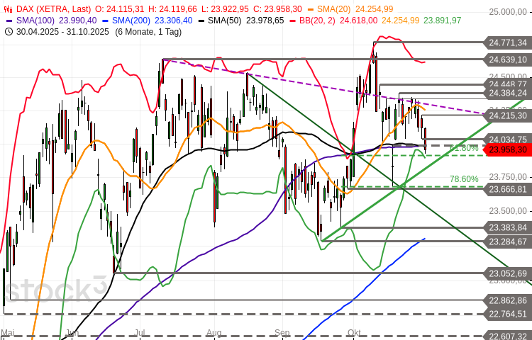 Der DAX neigte am Freitag von Beginn des Handels an zur Schwäche. Er rutschte aus der etablierten Kurzfrist-Range bis auf ein 10-Tages-Tief bei 23.923 Punkten und schloss bei 23.958 Punkten.