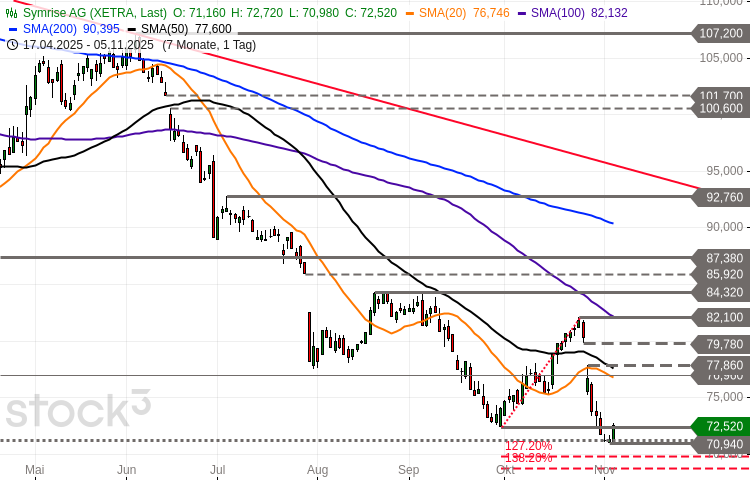 Die Aktie von Symrise (WKN: SYM999) hatte im November 2021 nach langjähriger Hausse ein Rekordhoch bei 132,65 EUR erzielt. Dort startete ein weiterhin intakter Bärenmarkt. Das Papier des Duft- und Aromenherstellers verlor in den vergangenen zwölf Monaten rund 32% an Wert. Der jüngste Kursrutsch vom Reaktionshoch im Oktober drückte die Notierung auf ein Mehrjahrestief bei 70,94 EUR. In der Schlusskursbetrachtung konnte sie jedoch das damit im Test befindliche Corona-Crash-Tief vom März 2020 bei 71,20 EUR verteidigen. Im gestrigen Handel setzte sich der Wert deutlicher nach oben ab und überwand per Tagesschluss das letzte Reaktionstief vom September (72,40 EUR). Mit Blick auf positive Divergenzen in den überverkauften momentumbasierten Indikatoren erscheint eine deutlichere technische Erholungsbewegung vorstellbar. Als potenzielle Erholungsziele fungieren die Bereiche 73,57 EUR, 75,20 EUR und 76,52-77,84 EUR. Zu einer moderaten Aufhellung auch des mittelfristigen Chartbildes bedürfte es eines nachhaltigen Anstiegs über die letztgenannte Widerstandszone. Zur Machtübernahme in diesem Zeitfenster müssten die Bullen den Anteilsschein jedoch über die Zone 82,10-84,32 EUR befördern. Ein Rutsch unter 70,76/70,94 EUR würde das Erholungsszenario zerstören und zunächst für unmittelbare weitere Abgaben in Richtung 69,76/69,92 EUR und eventuell 68,70 EUR sprechen. In der mittleren Frist müsste ein Test der Supportregion 64,13/64,16 EUR eingeplant werden.
