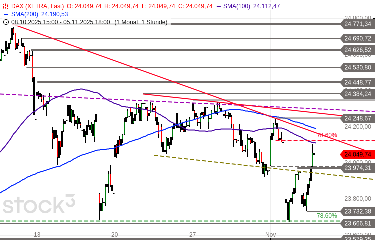 Die Erholungsbewegung im weiterhin intakten übergeordneten Abwärtstrend vom Rekordhoch kann sich unmittelbar ausdehnen, solange die Supportzone bei 23.918-23.974 Punkten nicht per Stundenschluss verletzt wird. Der Index sieht sich jedoch gestaffelten Widerständen bei 24.104-24.126 Punkten, 24.165 Punkten und 24.191-23.384 Punkten gegenüber. Erst mit einem Anstieg über die letztgenannte breite Barriere käme es zu einer deutlicheren Aufhellung der technischen Ausgangslage. Unterhalb von 23.918 Punkten würden zunächst Unterstützungen und potenzielle Auffangbereiche bei 23.794 Punkten, 23.732 Punkten und 23.667-23.712 Punkten in den Fokus rücken.