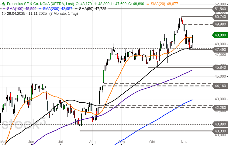 Die Aktie von Fresenius SE (WKN: 578560) hatte nach dem Erreichen eines Allzeithochs im Jahr 2017 bei 80,07 EUR einen Bärenmarkt gestartet, der sie bis auf ein im Oktober 2022 gesehenes 11-Jahres-Tief bei 19,69 EUR zurückführte. Ausgehend von der dort befindlichen Langfristunterstützung (Tief aus dem Jahr 2011 bei 19,60 EUR) initiierte das Papier einen weiterhin intakten übergeordneten Aufwärtstrend. Zuletzt vollzog es nach dem Markieren eines Mehrjahreshochs bei 50,74 EUR am 30. Oktober einen Rücksetzer an die steigende 50-Tage-Linie. Die darauf am 10. November geformte Bullish-Harami-Kerze wurde mit dem gestrigen deutlichen Kursanstieg bestätigt. Zugleich überwand der Anteilsschein seine 20-Tage-Linie. In der kurzen bis mittleren Frist bleiben die Bullen in einer starken Position, solange der Supportbereich 47,49-47,73 EUR nicht verletzt wird. Mögliche nächste Ziele und Widerstände befinden sich bei 49,12 EUR, 49,50 EUR, 49,84-50,05 EUR und 50,56-50,74 EUR. Darüber würde der primäre Aufwärtstrend bestätigt mit potenziellen nächsten Zielen bei 51,54-51,68 EUR und 52,78/52,82 EUR. Ein Rutsch unter 47,49 EUR würde derweil zunächst eine Ausdehnung der Abwärtskorrektur auf die Agenda rücken. In diesem Fall liegen mögliche nächste Auffangbereiche bei 46,74-47,21 EUR und 45,60-46,16 EUR.
