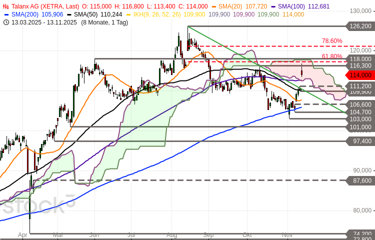 Die Aktie des Versicherers Talanx (WKN: TLX100) weist einen langfristigen Aufwärtstrend auf. In den vergangenen zwölf Monaten konnte sie um 46% zulegen. Mitte August startete der Wert nach dem Markieren eines Rekordhochs bei 126,20 EUR einen korrektiven Abwärtstrend. Dieser drückte die Notierung bis auf ein am 4. November im Bereich der steigenden 200-Tage-Linie verbuchtes 6-Monats-Tief bei 103,00 EUR. Die an diesem Tag geformte bullishe Engulfing-Kerze initiierte eine Erholungsrally. Mit der gestrigen Reaktion auf die Veröffentlichung der Quartalszahlen gelang dabei der Sprung über die korrektive Abwärtstrendlinie auf ein Mehrwochenhoch. Im charttechnischen Fokus steht nun die erreichte Widerstandszone 116,30-118,00 EUR. Deren Überwindung per Tagesschluss würde die erneute Machtübernahme seitens der Bullen im mittelfristigen Zeitfenster bestätigen und nächste potenzielle Ziele und Hürden bei 120,00-121,24 EUR und 126,20 EUR in den Blick rücken. Darüber würde schließlich auch der primäre Haussetrend bestätigt mit Chancen in Richtung zunächst 132,15/135,06 EUR. Ein möglicher Rücksetzer vom aktuellen Widerstandsniveau würde auf nächste potenzielle Auffangbereiche bei 112,68 EUR und 109,90-111,20 EUR treffen. Ein Tagesschluss darunter würde bereits das kurzfristige Chartbild eintrüben. Unmittelbar bearishe Signale entstünden erst mit der Verletzung der Supportbereiche 104,70-106,60 EUR sowie 103,00 EUR.