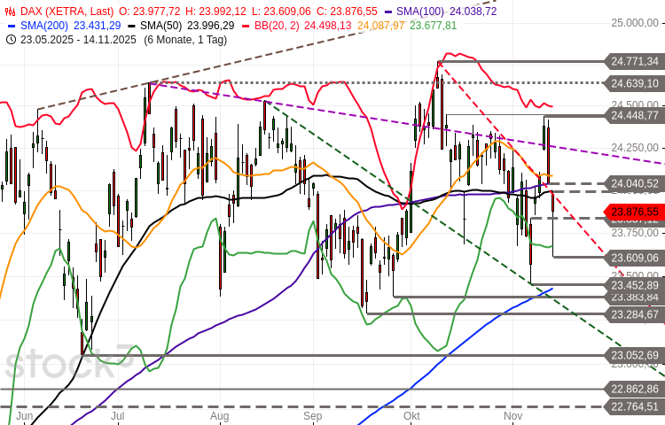 Der DAX eröffnete am Freitag mit einer Abwärtslücke und rutschte nachfolgend weiter bis auf ein am Nachmittag verbuchtes 5-Tages-Tief bei 23.609 Punkten. Dank einer Rally im späten Geschäft konnte er die Verluste teilweise eindämmen und schloss bei 23.877 Punkten.