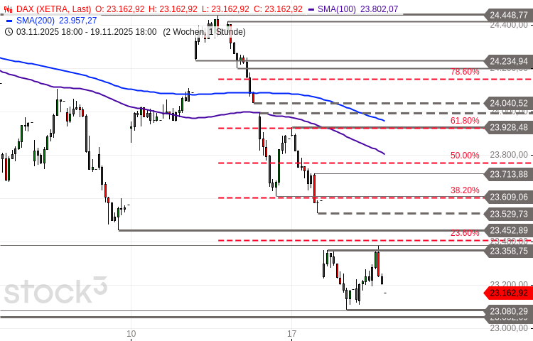 Der DAX startete gestern einen Stabilisierungsversuch und erholte sich ausgehend vom am Vortag erreichten Ziel- und Supportbereich bis auf ein 2-Tages-Hoch bei 23.379 Punkten. Am dort befindlichen Widerstandsbereich einsetzende Gewinnmitnahmen drückten die Notierung bis auf 23.163 Punkte.