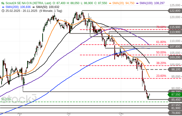 Die Aktie von Scout24 (WKN: A12DM8) war im Rahmen des langfristigen Aufwärtstrends bis auf ein im Juli bei 122,80 EUR markiertes Rekordhoch haussiert. Die darunter initiierte Top-Bildung wurde im August komplettiert. Seither rutschte der Wert bis auf ein am 18. November gesehenes 10-Monats-Tief. Er hatte damit fast 50% der vorausgegangenen Haussebewegung korrigiert und zeigt nun einen Stabilisierungsansatz darüber. Mit Blick auf die extrem überverkauften markttechnischen Indikatoren (RSI-Indikator auf Tagesbasis erreichte das tiefste Niveau seit dem Corona-Crash) würde eine deutlichere Erholungsbewegung nicht überraschen. Oberhalb der nächsten Widerstandsregion bei 88,70-90,00 EUR könnte sich eine solche in Richtung 94,27 EUR ausdehnen. Der mittelfristige Abwärtstrend würde hierdurch jedoch noch nicht in seinem Bestand gefährdet. Mit einer Verletzung der aktuellen Supportzone bei 84,46/85,45 EUR per Tagesschluss entstünde derweil ein bearishes Anschlusssignal. In diesem Fall würde sich der charttechnische Fokus auf die nächste potenzielle Auffangregion bei 81,90/82,95 EUR richten. Darunter würde der bedeutendere Support bei 79,80 EUR (Hoch vom September 2020) ins Spiel kommen.