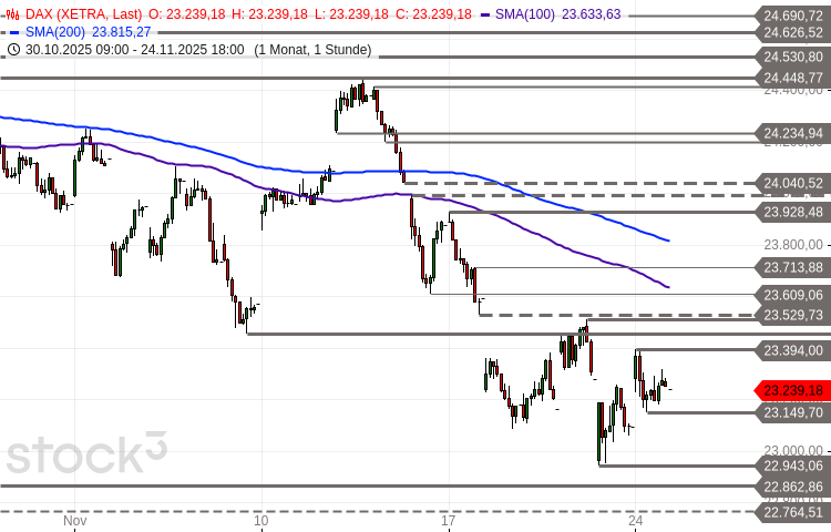 Das kurzfristige technische Bias gestaltet sich zur heutigen Eröffnung neutral. Übergeordnet verbleibt die Preiskurve in einem mittelfristigen Abwärtstrend vom Rekordhoch. Nächste Widerstände liegen bei 23.392/23.394 Punkten und 23.453-23.530 Punkten. Darüber würde sich das kurzfristige Chartbild aufhellen mit möglichen Erholungszielen und nächsten Barrieren bei 23.609/23.634 Punkten und 23.692/23.714 Punkten. Unterstützt ist die Preiskurve als nächstes bei 23.150 Punkten und 23.053-23.085 Punkten. Darunter (Stundenschlusskursbasis) würde das Risiko einer zeitnahen Fortsetzung des dominanten Abschwungs wieder in den Vordergrund rücken mit möglichen Zielen bei 22.943 Punkten und 22.842/22.863 Punkten.
