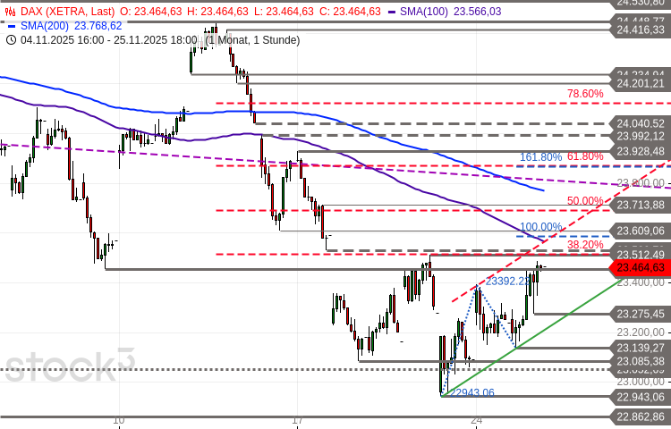 Der DAX dehnte seine Erholung im gestrigen Handel schwungvoll aus und erreichte im späten Handel ein 3-Tages-Hoch bei 23.487 Punkten. Mit 23.465 Punkten schloss er knapp unter der am 18. November unterschrittenen 200-Tage-Linie (23.476).