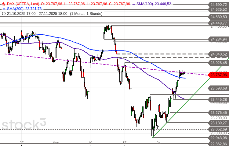 Der DAX präsentierte sich gestern lediglich im frühen Handel stark. Unterhalb des Hochs der ersten Stundenkerze bei 23.831 Punkten schwenkte der Index in eine Seitwärtskonsolidierung ein.