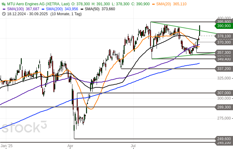 Die Aktie von MTU Aero Engines (WKN: A0D9PT) weist einen intakten langfristigen Aufwärtstrend auf. Auf Sicht der vergangenen zwölf Monate konnte sie um rund 37 Prozent zulegen. Zuletzt war sie vom im April bei 249,60 EUR gesehenen Korrekturtief bis auf ein im Juli verzeichnetes Allzeithoch bei 395,80 EUR haussiert. Darunter startete der Wert eine Seitwärtskorrektur und blieb dabei oberhalb seiner steigenden 200-Tage-Linie. Mit dem gestrigen dynamischen Kursanstieg (+4,57%) überwand er begleitet von hohem Volumen die fallende Eindämmungslinie vom Juli-Hoch. Der übergeordnete Aufschwung könnte sich daher zeitnah fortsetzen. Bestätigt würde dieses Szenario mit einem nachhaltigen Tagesschluss über 395,80/396,65 EUR. Als potenzielle nächste Ausdehnungsziele fungieren im Erfolgsfall die Bereiche 408,42-413,53 EUR und 421,76/424,48 EUR. Die Bullen bleiben in einer starken Position, solange die ehemalige Eindämmungslinie bei derzeit 384,78 EUR (täglich 0,22 EUR fallend) nicht per Tagesschluss unterboten wird. Deutlicher eintrüben würde sich die Ausgangslage unterhalb der Supportzone bei 367,69-373,66 EUR sowie 354,40-357,30 EUR.