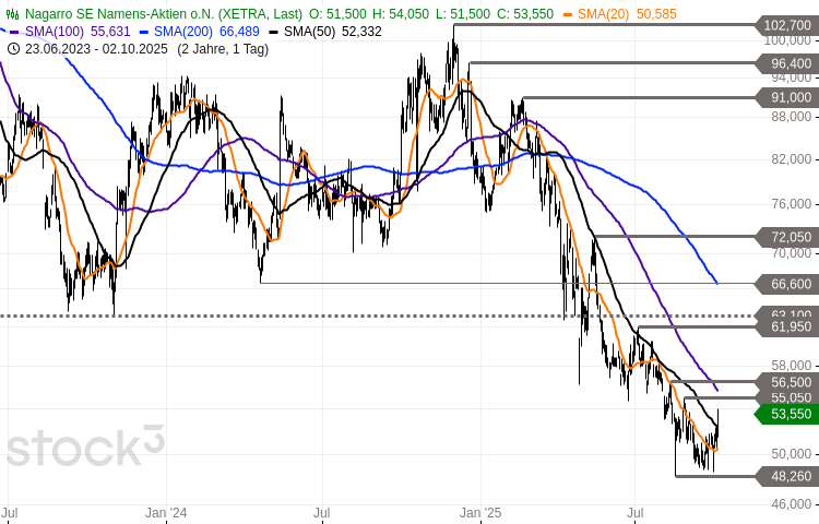 Die Aktie von Nagarro (WKN: A3H220) hatte im Januar 2022 ein Rekordhoch bei 212,00 EUR markiert und schlug anschließend übergeordnet den Weg gen Süden ein. Zuletzt hatte sie im August dieses Jahres ein Allzeittief bei 48,26 EUR verzeichnet. Das Kursgeschehen seither stellt bislang eine Stabilisierung dar, aus der mit Blick auf das Handelsvolumen und die markttechnischen Indikatoren auch mehr werden könnte. Im gestrigen Handel überwand der Wert seine zuletzt wiederholt als Widerstand fungierende 50-Tage-Linie. Der MACD-Indikator hatte zuvor bereits aus einer bullishen Divergenz heraus ein Kaufsignal generiert und überwand gestern seine Nulllinie. Im charttechnischen Fokus steht nun die nächste Ziel– und Widerstandsregion 55,05-56,50 EUR. Deren nachhaltige Überwindung per Tagesschluss würde einen mittelfristigen Boden komplettieren und den Kursbereich 60,50-63,10 EUR als mögliches nächstes Ziel aktivieren. Ein bearishes Anschlusssignal entstünde derweil unterhalb von 48,26 EUR mit möglichen Ausdehnungszielen bei 45,67/46,41 EUR und 44,06 EUR.