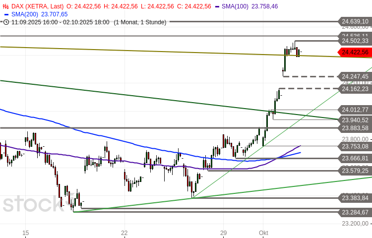 Der DAX setzte gestern seinen dynamischen Aufschwung fort. Er überwand seine vom Juli-Hoch etablierte korrektive Abwärtstrendlinie und verzeichnete ein Mehrwochenhoch bei 24.502 Punkten. Darunter ging er nach der Ausformung einer bearishen Shooting-Star-Kerze im Stundenchart im späten Handel in den Konsolidierungsmodus über.