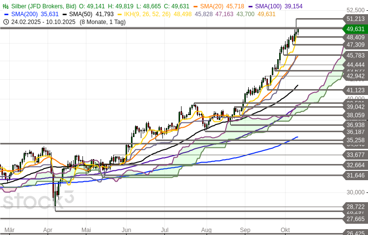 Der Silberpreis weist in allen Zeitebenen einen intakten und dynamischen Aufwärtstrend auf. Auf Sicht der vergangenen zwölf Monate konnte er um rund 58% zulegen. Dabei kam es in den vergangenen Wochen zu einer deutlichen Trendbeschleunigung. Das Plus im letzten Monat beläuft sich auf rund 20%. Im gestrigen Handel erreichte und überschritt der Spotpreis zeitweise den letzten verbleibenden historischen Widerstandsbereich, der aus den beiden Kursgipfeln der Jahre 1980 und 2011 bei knapp unter der 50 USD-Marke resultiert (Hoch im Comex-Future: 50,35 USD im Jahr 1980). Der Ausbruch erwies sich jedoch als Fehlausbruch, da die Notierung vom neuen Intraday-Hoch bei 51,21 USD nach Gewinnmitnahmen bis zum Ende des New Yorker Handels wieder unter die alten Bestmarken rutschte. Die Tageskerze signalisiert mit ihrem ausgeprägten oberen Schatten (Docht) Verkaufsbereitschaft auf dem erreichten Kursniveau. Mit Blick auf den RSI-Indikator ist die markttechnische Lage in allen Zeitebenen vom Tageschart bis zum Monatschart extrem überkauft. Auf Basis des Tagescharts liegt bereits eine negative Divergenz zur Preiskurve vor. Es ist daher eine erhöhte Wahrscheinlichkeit für eine zeitnah einsetzende Verschnaufpause oder auch deutlichere Abwärtskorrektur zu unterstellen. Preisliche Bestätigungen für eine derartige Schwächephase wären in Kursrückgängen unter die beiden nächsten Supportbereiche 48,41/48,50 USD und 47,31 USD zu sehen. In diesem Fall lauten die nächsten möglichen Auffangbereiche 45,72-45,89 USD und 44,88 USD. Ein nachhaltiger Anstieg über die Zone 51,00-51,69 USD per New Yorker Handelsschluss würde derweil ein prozyklisches Signal für eine unmittelbare Ausdehnung der Rally liefern. Mögliche mittelfristig relevante nächste Ausdehnungsziele lassen sich dann bei 60,21-65,89 USD, 73,42 USD und 88,00 USD ausmachen.