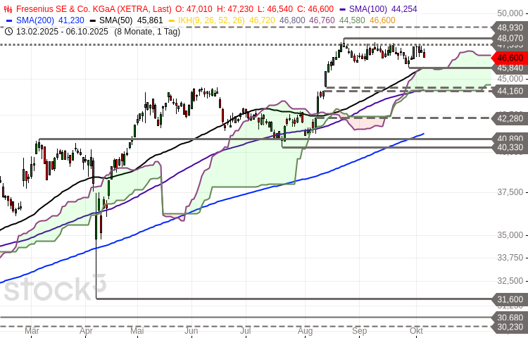 Die Aktie von Fresenius SE (WKN: 578560) hatte nach dem Erreichen eines Allzeithochs im Jahr 2017 bei 80,07 EUR einen Bärenmarkt gestartet, der sie bis auf ein im Oktober 2022 gesehenes 11-Jahres-Tief bei 19,69 EUR zurückführte. Ausgehend von der dort befindlichen Langfristunterstützung (Tief aus dem Jahr 2011 bei 19,60 EUR) initiierte das Papier einen weiterhin intakten übergeordneten Aufwärtstrend. Zuletzt schwenkte es nach dem Markieren eines Mehrjahreshochs bei 48,07 EUR im August in eine Seitwärtskorrektur ein. Relevanter Support liegt bei 45,84-45,86 EUR. Dort befindet sich die untere Begrenzung der etablierten Range, die steigende 50-Tage-Linie und die obere Begrenzung der Ichimoku-Wolke. Eine Verletzung dieses Unterstützungsbündels würde für einen deutlicheren Rücksetzer in Richtung zunächst 44,16-44,40 EUR sprechen. Mit Blick auf die Oberseite bedarf es der nachhaltigen Überwindung der Widerstandsregion 47,60-48,07 EUR per Tagesschluss, um ein prozyklisches Anschlusskaufsignal zu generieren. Im Erfolgsfall lauten die nächsten potenziellen Ausdehnungsziele 48,68-48,93 EUR, 49,45 EUR und 50,00-50,30 EUR. Eine nächste langfristig bedeutsame Hürde lässt sich bei 51,54-52,82 EUR ausmachen.