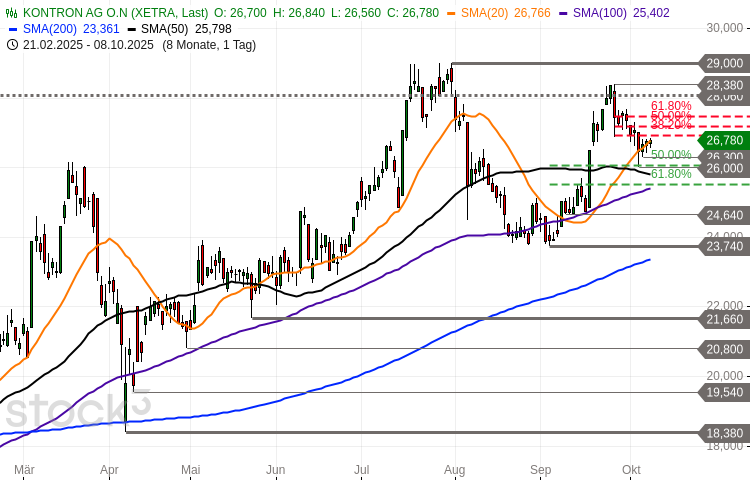 Die Kontron-Aktie (WKN: A0X9EJ) bewegt sich in einem intakten langfristigen Aufwärtstrend. Der letzte mittelfristige Kursschub beförderte sie vom Tief im November 2024 bei 15,15 EUR bis auf ein im Juli bei 29,00 EUR verbuchtes Dekadenhoch. Seither befindet sich der Wert im Korrekturmodus. Die Rally vom Korrekturtief bei 23,74 EUR wird aktuell ihrerseits korrigiert und traf dabei zuletzt im Bereich des 50%-Retracements und der 20-Tage-Linie auf Kaufinteresse. Eine erste prozyklische Bestätigung für einen zeitnahen erneuten Vorstoß in Richtung der langfristig bedeutsamen Widerstandszone 28,38-29,00 EUR wäre in einem Tagesschluss oberhalb der Barriere bei 27,19-27,47 EUR zu sehen. Die nachhaltige Überwindung der Marke von 29,00 EUR würde den Aufwärtstrend in allen Zeitebenen bestätigen und mögliche nächste Ausdehnungsziele bei 30,43 EUR, 31,01 EUR und 32,25/32,64 EUR in den Blick rücken. Ein Rutsch unter 26,30 EUR würde derweil in der kurzen Frist Abwärtsrisiken in Richtung 25,80-26,06 EUR und 25,40/25,51 EUR mit sich bringen. Ein Tagesschluss unterhalb der letztgenannten Zone würde das technische Bild weiter eintrüben und für eine zeitliche Ausdehnung der im Juli gestarteten Korrekturphase sprechen.