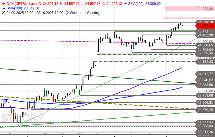 Nach diesem bullishen Ausbruch aus der Konsolidierung richtet sich der charttechnische Fokus auf das in unmittelbarer Rufweite befindliche Rekordhoch aus dem Juli bei 24.639 Punkten. Dessen nachhaltige Überwindung würde das bullishe Bias in allen Zeitebenen bestätigen. Darüber befinden sich nächste potenzielle Ausdehnungsziele bei 24.681/24.694 Punkten, 24.778/24.832 Punkten, 24.935 Punkten und 25.000/25.008 Punkten. Unterstützt ist der Index als nächstes bei 24.524/24.536 Punkten, 24.483 Punkten, 24.444 Punkten und 24.361 Punkten. Darunter käme es zu einer Eintrübung des kurzfristigen Chartbildes und es wäre eine mehrtägige Verschnaufpause einzuplanen.