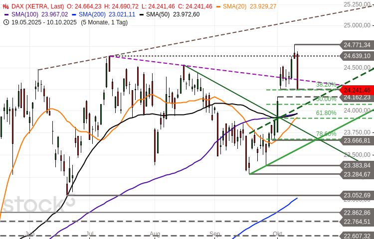 Er befindet sich damit im Korrekturmodus bezogen auf den vorausgegangenen Kursschub vom 25. September. Dabei hat er punktgenau das 38,2%-Fibonacci-Retracement abgearbeitet und den Support der Aufwärtslücke vom 2. Oktober erreicht. Eine Stabilisierung oder technische Erholung würde an dieser Stelle auch mit Blick auf die überverkauften markttechnischen Indikatoren auf Basis des Stundencharts nicht überraschen. Nächste Widerstände befinden sich bei 24.290/24.367 Punkten, 24.444/24.446 Punkten und 24.506-24.531 Punkten. Darüber (Stundenschlusskursbasis) käme es zu einer Aufhellung des kurzfristigen Chartbildes mit nächsten Barrieren bei 24.569 Punkten, 24.627-24.691 Punkten und 24.771 Punkten (Rekordhoch vom 9. Oktober). Ein signifikanter Rutsch unter 24.241 Punkte würde eine unmittelbare Fortsetzung des korrektiven Abschwungs nahelegen, mit nächstem Ziel 24.162 Punkte (Unterkante der Aufwärtslücke). Darunter käme es zu einer weiteren Eintrübung des kurzfristigen Chartbildes mit möglichen Zielen bei 24.050/24.078 Punkten, 24.013 Punkten und 23.884-23.973 Punkten.