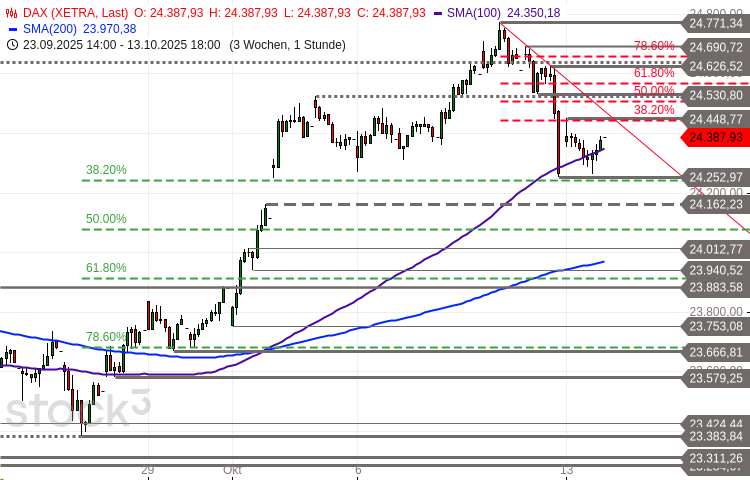 Der DAX stabilisierte sich gestern oberhalb des mit dem Tief vom Freitag erreichten 38,2%-Fibonacci-Retracement. Er pendelte zwischen 24.261 und 24.449 Punkten und schloss bei 24.388 Zählern, einem Plus von 146 Punkten gegenüber dem Vortagesschluss.