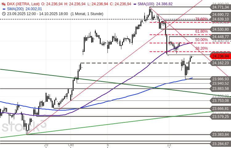 Die auf Basis des Tagescharts geformte Hammer-Kerze bestätigt mit ihrem ausgeprägten unteren Schatten den Nachfrageüberhang am Supportcluster. Eine Ausdehnung der Erholungsrally erscheint im heutigen Handel plausibel. Nächste Widerstände und potenzielle Erholungsziele liegen bei 24.241-24.287 Punkten und 24.345-24.389 Punkten. Ein signifikanter Stundenschluss oberhalb der letztgenannten Zone würde das kurzfristige Bild aufhellen und mögliche nächste Barrieren bei 24.444-24.472 Punkten, 24.524/24.531 Punkten und 24.586-24.639 Punkten in den Blick rücken. Mit Blick auf die Unterseite ist die Zone 23.987-24.013 Punkte kurzfristig kritisch. Deren nachhaltige Verletzung würde eine Ausdehnung und eventuell Beschleunigung des intakten korrektiven Abwärtstrends vom Rekordhoch nahelegen. Nächste potenzielle Auffangbereiche liegen in diesem Fall bei 23.941 Punkten, 23.884/23.914 Punkten, 23.753 Punkten und 23.667-23.711 Punkten.