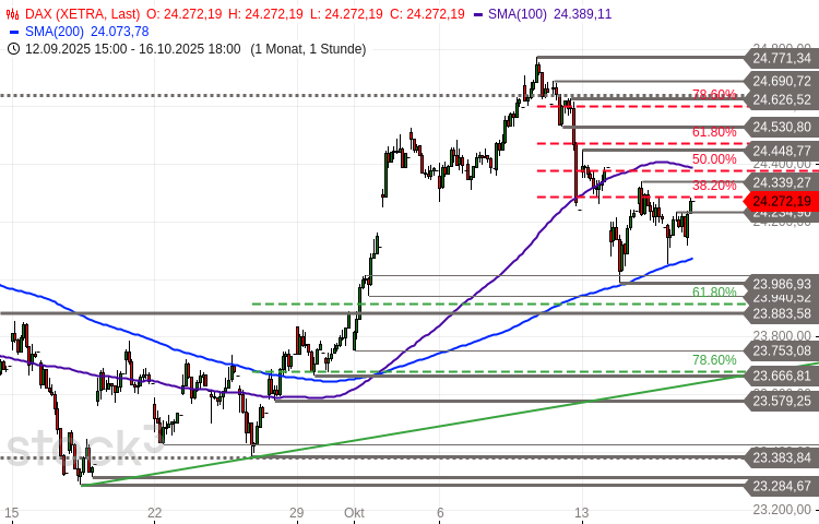 Der DAX verzeichnete gestern in der ersten Stunde ein 2-Tages-Tief bei 24.052 Punkten und konnte sich nachfolgend bis auf ein in der letzten Stunde gesehenes Tageshoch bei 24.284 Punkten erholen.