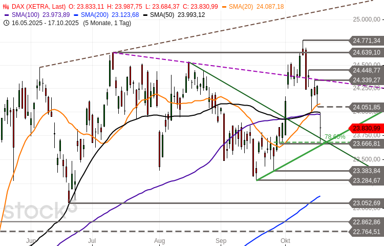 Der Tagesschluss bei 23.831 Punkten hinterließ eine Doji-Tageskerze mit ausgeprägten Schatten zu beiden Seiten. Im Rahmen des intakten korrektiven Abwärtstrends vom am 9. Oktober bei 24.771 Punkten markierten Rekordhoch besteht mit Blick auf die am erreichten Support geformte Umkehrkerze die Chance auf eine deutlichere Erholungsbewegung. Nächste Widerstände und potenzielle Erholungsziele liegen bei 23.941-23.993 Punkten und 24.052-24.118 Punkten. Ein Stundenschluss oberhalb der letztgenannten Zone würde das kurzfristige Chartbild weiter aufhellen. Mit einem möglichen nachhaltigen Rutsch unter die aktuelle Supportzone bei 23.658-23.711 Punkten entstünde derweil ein prozyklisches bearishes Anschlusssignal mit möglichen nächsten Zielen bei 23.579 Punkten und 23.384/23.424 Punkten.