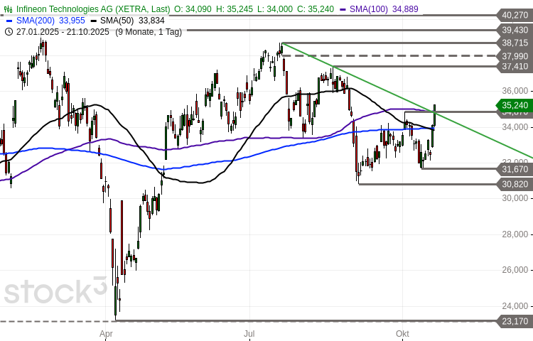 Die Aktie des Halbleiterkonzerns Infineon (WKN: 623100) bewegt sich seit 2023 in einer breiten Stauzone, die sich von 23,17 EUR bis 40,27 EUR erstreckt. Zur Generierung eines prozyklischen Signals im langfristigen Zeitfenster bedarf es eines nachhaltigen Ausbruches aus der genannten Range. Mit Blick auf das mittelfristige Chartbild hatte der Wert ausgehend vom April-Tief (23,17 EUR) eine dynamische Rally gezeigt, die von einer dreiwelligen Abwärtskorrektur unterbrochen wurde. Mit dem gestrigen Kursschub über das Widerstandscluster resultierend aus dem Reaktionshoch vom 2. Oktober, der korrektiven Abwärtstrendlinie und der 100-Tage-Linie meldeten sich die Bullen zurück. Das kurz- bis mittelfristige Chartbild bleibt aussichtsreich, solange der aktuelle Support bei 34,77-34,89 EUR per Tagesschluss verteidigt werden kann. Potenzielle nächste Ziele und Hürden befinden sich bei 37,41 EUR und 38,72 EUR.