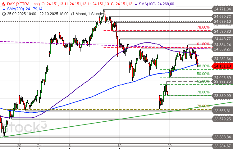 Die erst am Montag zurückeroberte steigende 20-Tage-Linie wurde damit wieder unterschritten. Das kurzfristige technische Bias ist zur heutigen Eröffnung neutral. Ein Rutsch unter den nächsten Support bei 24.117 Punkten würde die kritische Unterstützungszone bei aktuell 23.988-24.034 Punkten in den charttechnischen Fokus rücken. Deren nachhaltige Verletzung würde den Bären den technischen Vorteil verschaffen. Nächste Barrieren auf der Oberseite befinden sich bei 24.179/24.184 Punkten, 24.232-24.269 Punkten und 24.338-24.384 Punkten. Ein Stundenschluss oberhalb der letztgenannten Zone ist erforderlich, um das technische Bias auf bullish zu drehen.
