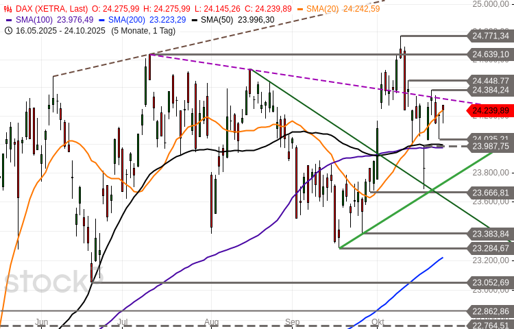 Der DAX pendelte am Freitag um den Vortagesschluss in einer Range von 24.145 Punkten bis 24.276 Punkten. Mit 24.240 Punkten schloss er mit einem Tagesplus von 32 Punkten.