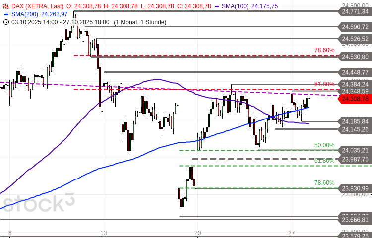 Der DAX pendelte gestern nach einer festen Eröffnung um den Vortagesschluss in einer Spanne von 24.186 Punkten und 24.349 Punkten und verabschiedete sich bei 24.309 Punkten aus dem Handel.