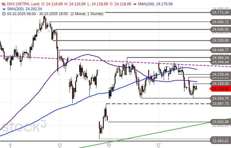 Der DAX verblieb auch gestern in seiner seit dem 20. Oktober etablierten Trading-Range. Er pendelte um den Vortagesschluss in einer Spanne von 24.035 Punkten bis 24.215 Punkten.
