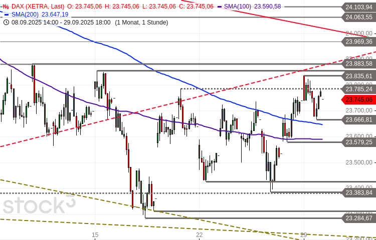 Der DAX eröffnete gestern freundlich. Ausgehend vom zur Eröffnung bei 23.836 Punkten markierten Tageshoch ging es anschließend in drei Wellen abwärts bis auf ein Tief bei 23.667 Punkten. Es folgte eine Erholung im späten Handel und ein Tagesschluss bei 23.745 Punkten, einem Tagesplus von 6 Punkten.
