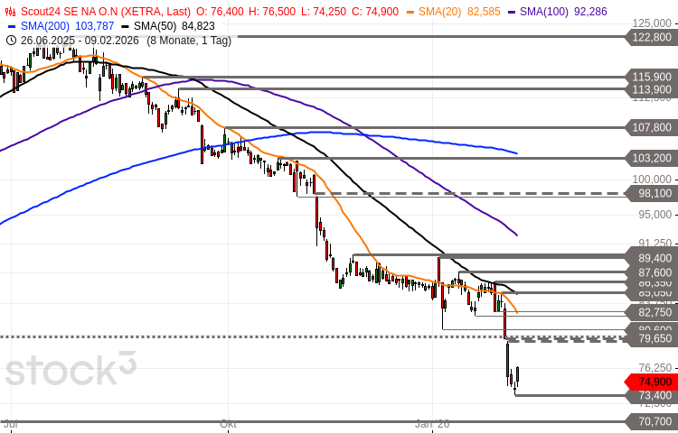 Die Aktie von Scout24 (WKN: A12DM8) war im Rahmen des langfristigen Aufwärtstrends bis auf ein im Juli 2025 bei 122,80 EUR markiertes Rekordhoch haussiert. Die darunter initiierte Top-Bildung wurde im August komplettiert. Seither orientiert sich der Wert in der mittleren Frist südwärts. Der Abschwung beschleunigte sich ab November. Zuletzt erreichte die Notierung eine langfristig bedeutsame Unterstützungsregion und formte am 6. Februar oberhalb des bei 73,40 EUR markierten 2-Jahres-Tiefs bei extrem überverkauften markttechnischen Indikatoren eine bullishe Reversalkerze (Doji) im Tageschart. Eine weitergehende technische Erholungsbewegung erscheint daher in der kurzen Frist vorstellbar. Eine belastbare Bodenbildung zeichnet sich indes noch nicht ab. Nächste Hürden und potenzielle Erholungsziele lassen sich bei 79,25-80,60 EUR und 82,25-82,75 EUR ausmachen. Zu einer Aufhellung der mittelfristigen Ausgangslage bedürfte es der nachhaltigen Überwindung der breiten Widerstandszone bei aktuell 84,82-89,80 EUR. Ein Rutsch unter 73,40 EUR per Tagesschluss würde das Erholungsszenario zerstören und eine Fortsetzung des dominanten Abwärtstrends mit möglichen nächsten Ausdehnungszielen bei 70,70 EUR und 68,70 EUR nahelegen.