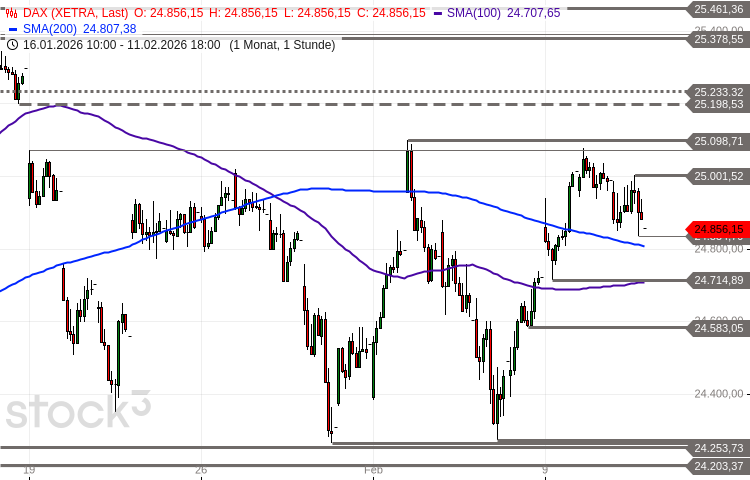 Der DAX setzte gestern seine Konsolidierung des jüngsten Rallyschubes fort und zeigte Stabilisierungstendenzen oberhalb des Verlaufstiefs bei 24.835 Punkten.