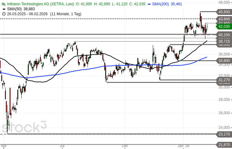 Die Aktie des Halbleiterkonzerns Infineon (WKN: 623100) bewegte sich seit 2023 in einer breiten Stauzone, die sich von 23,17 EUR bis 40,27 EUR erstreckte. Am 6. Januar gelang der Ausbruch auf der Oberseite und damit ein bullishes Anschlusssignal. Der nachfolgende Anstieg über das Hoch aus dem Jahr 2021 bei 43,85 EUR erwies sich jedoch als Fehlausbruch. Ausgehend von Verlaufshoch bei 45,60 EUR erfolgte ein Pullback. Im charttechnischen Fokus steht nun die breite Supportzone bei 38,06-40,27 EUR. Können die Bullen diese Zone verteidigen, bleibt der mittelfristige Aufwärtstrend ungefährdet. Darunter müsste hingegen eine Ausdehnung der Abwärtskorrektur in Richtung der kritischen Unterstützungsregion 34,80-37,00 EUR eingeplant werden. Nächste Widerstände befinden sich bei 42,80 EUR, 43,44-43,85 EUR und 45,60-46,80 EUR. Darüber würde die übergeordnete Hausse bestätigt mit möglichen nächsten Ausdehnungszielen bei 48,38 EUR, 50,84-52,58 EUR und 55,97/57,37 EUR.