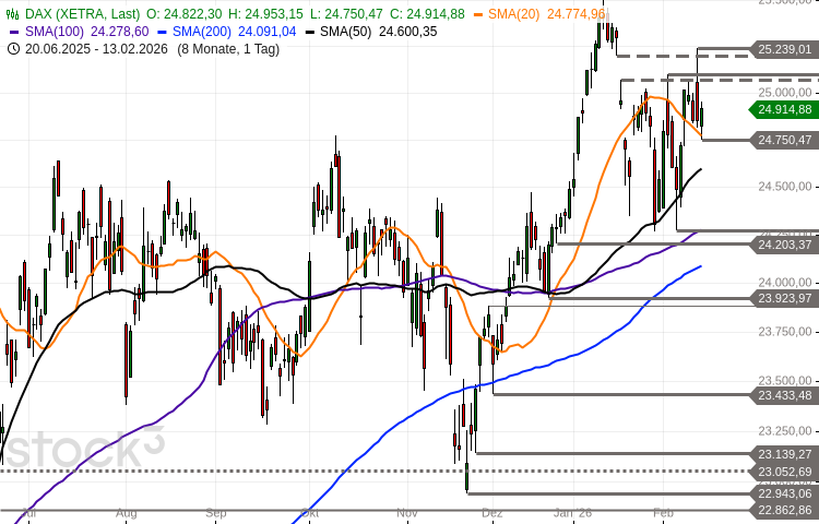 Der DAX markierte am Freitag in der ersten Handelsstunde ein 4-Tages-Tief bei 24.750 Punkten. Darüber konnte er sich stabilisieren und im späten Geschäft ein Tageshoch bei 24.953 Punkten markieren.