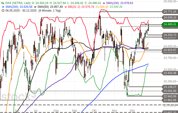 Der kurz- und mittelfristige Trend weist weiter nordwärts. Übergeordnet pendelt der Index seit Mai in einer Schiebezone volatil seitwärts. Mit den jüngsten Kursavancen befindet sich das Rekordhoch vom Oktober bei 24.771 Punkten wieder in unmittelbarer Rufweite. Potenzielle zwischengeschaltete Ziele und Hürden liegen bei 24.531 Punkten, 24.579 Punkten und 24.627/24.639 Punkten. Mit Blick auf die Unterseite lassen sich nächste Supportbereiche bei 24.389-24.401 Punkten, 24.305 Punkten und 24.243-24.254 Punkten ausmachen. Die Bullen bleiben in einer starken Position, solange die letztgenannte Zone nicht per Stundenschluss unterboten wird.
