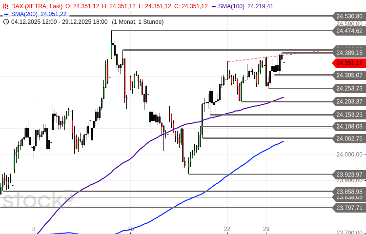 Die technische Ausgangslage gestaltet sich zur heutigen Eröffnung neutral. Auf der Oberseite wird der Index bei 24.389-24.475 Punkten gedeckelt. Ein Tagesschluss darüber ist zur Generierung eines bullishen Anschlusssignals erforderlich. Im Erfolgsfall liegen nächste potenzielle Barrieren und Ziele bei 24.531 Punkten, 24.627 Punkten, 24.691 Punkten und 24.771 Punkten. Die nächsten Unterstützungen lassen sich bei 24.305 Punkten, 24.254 Punkten und 24.203-24.227 Punkten ausmachen. Darunter (Stundenschlusskursbasis) käme es zu einer leichten Eintrübung des kurzfristigen Chartbildes mit Abwärtsrisiken in Richtung zunächst 24.153 Punkte, 24.108 Punkte und 24.051-24.063 Punkte.