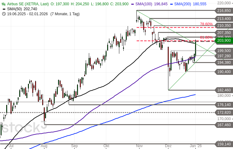 Die Aktie der Airbus Group (WKN: 938914) bewegt sich in einem intakten langfristigen Haussetrend. Auf Sicht der vergangenen zwölf Monate konnte sie um rund 29 Prozent zulegen. Zuletzt hatte sie im Oktober bei 216,85 EUR ein Rekordhoch verzeichnet und war anschließend in den Korrekturmodus eingeschwenkt. Am 1. Dezember kam es zu einem hochvolumigen Sell-off und der Ausbildung eines Korrekturtiefs bei 182,46 EUR oberhalb der steigenden 200-Tage-Linie. Seither orientiert sich die Notierung wieder nordwärts und konnte am Freitag im Rahmen einer zweiten Aufwärtswelle ein relevantes Widerstandscluster in Gestalt unter anderem der korrektiven Abwärtstrendlinie, der 50-Tage-Linie und des 61,8%-Fibonacci-Retracements überwinden. Potenzielle nächste Hürden und Kursziele lassen sich bei 205,30 EUR und 207,35-210,35 EUR ausmachen. Mit einem Tagesschluss über der letztgenannten Zone würde die erneute Machtübernahme durch die Bullen im mittelfristigen Zeitfenster bestätigt. Nächste mögliche Etappenziele liegen im Erfolgsfall bei 213,40 EUR, 216,85/217,91 EUR und 224,42-226,93 EUR. Mit Blick auf die Unterseite bleibt das Chartbild konstruktiv, solange nicht im Rahmen eines möglichen Pullbacks die Supportzone 194,38-197,28 EUR per Tagesschluss verletzt wird. Darunter entstünden hingegen Abwärtsrisiken in Richtung 190,40 EUR und 180,56-182,46 EUR.