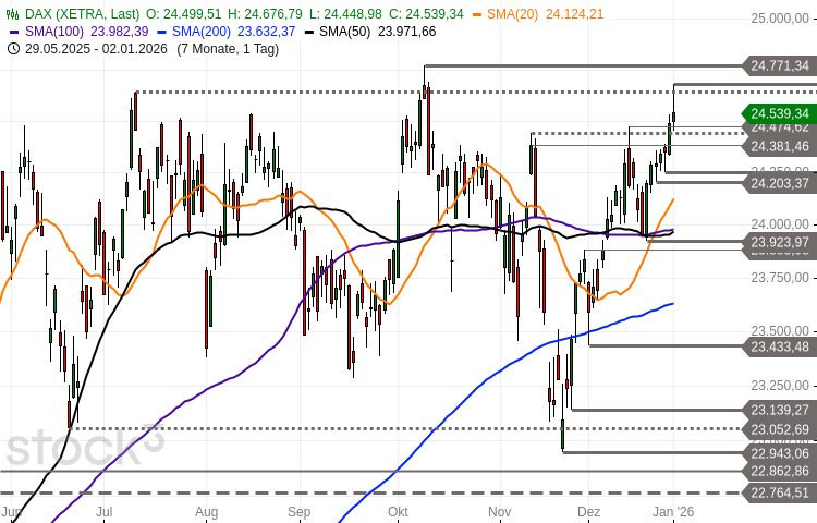 Der Index hat nun wieder das obere Ende der mehrmonatigen Stauzone erreicht. Sowohl der langfristige Haussetrend als auch der mehrwöchige Aufwärtstrend vom November-Tief sind intakt und die Preiskurve befindet sich oberhalb aller relevanten gleitenden Durchschnittslinien. Nächste Widerstände befinden sich heute bei 24.614 Punkten, 24.677/24.691 Punkten und 24.771 Punkten (Rekordhoch). Ein Tagesschluss über 24.832 Punkten würde die Vorherrschaft der Bullen bestätigen und mögliche nächste Zielbereiche bei 25.269-25.470 Punkten und 25.901-26.165 Punkten in den Fokus rücken. Nächste Unterstützungen liegen bei 24.449-24.500 Punkten, 24.381-24.400 Punkten, 24.305 Punkten, 24.270 Punkten und 24.203-24.254 Punkten. Darunter käme es zu einer leichten Eintrübung des kurzfristigen Chartbildes.