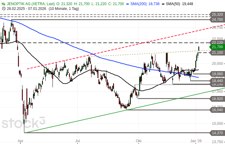 Die Jenoptik-Aktie (WKN: A2NB60) hatte im April bei 14,37 EUR ein 5-Jahres-Tief markiert. Im Rahmen der zweiten Aufwärtswelle des seither etablierten mittelfristigen Aufwärtstrends kam zuletzt nach mehrmonatigem Pendeln um die 200-Tage-Linie deutlicher Schwung in die Notierung. Vom Dezember-Tief konnte sie in der Spitze um rund 18 % zulegen. Bereits Ende November generierten die gleitenden Durchschnittslinien der vergangenen 50 und 200 Tage ein bullishes Crossing („Golden Cross“). Das Handelsvolumen bestätigt den Aufwärtstrend. Mit dem gestrigen Kursschub (+2,84 %) überwand das Papier eine bedeutsame Widerstandszone und verbuchte ein 10-Monats-Hoch. Potenzielle nächste Ausdehnungsziele und Hürden befinden sich bei 22,12/22,37 EUR, 23,49-24,09 EUR und 24,70-25,32 EUR. Oberhalb der letztgenannten Zone würde sich das längerfristige Chartbild deutlicher aufhellen. Nächste Unterstützungen und potenzielle Auffangbereiche im Fall eines Rücksetzers befinden sich bei 21,00-21,30 EUR und 19,90-20,29 EUR. Die bullishe Perspektive im mittelfristigen Zeitfenster würde erst unterhalb 19,06-19,57 EUR getrübt.