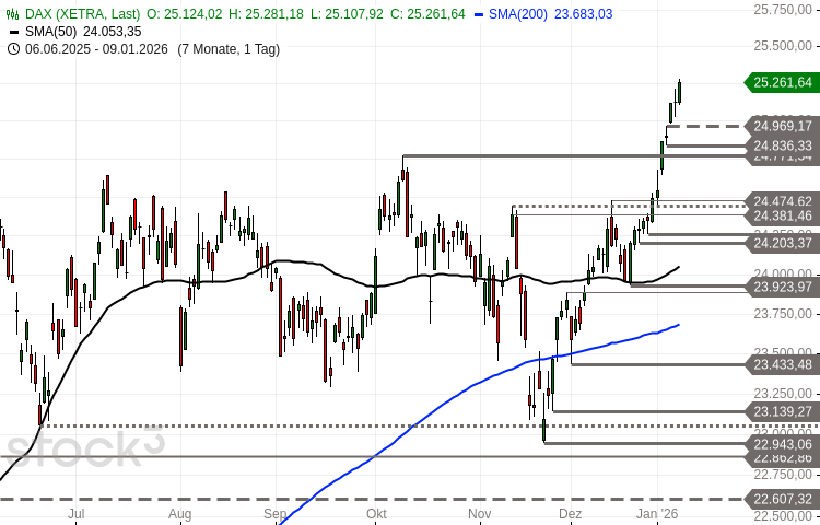 Der DAX schraubte sich am Freitag weiter nach oben bis auf ein am Nachmittag verbuchtes neues Allzeithoch bei 25.281 Punkten. Nach Gewinnmitnahmen schloss er bei 25.262 Punkten.