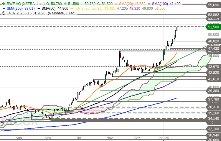 Die RWE-Aktie (WKN: 703712) weist in allen relevanten Zeitebenen einen intakten und dynamischen Aufwärtstrend auf. In den vergangenen zwölf Monaten konnte sie um rund 75 % zulegen. Zuletzt hatte der Wert am 5. Januar mit der bullishen Auflösung einer mehrwöchigen Verschnaufpause ein Anschlusskaufsignal generiert. Am Freitag verzeichnete er nach drei hochvolumigen Plustagen in Folge ein 15-Jahres-Hoch bei 51,58 EUR. Mit Blick auf die deutlich überhitzten markttechnischen Indikatoren auf Basis des Tagescharts und Wochencharts sowie einen erreichten Gap-Widerstand aus dem Jahr 2011 muss eine erhöhte Wahrscheinlichkeit für eine zeitnah einsetzende Verschnaufpause unterstellt werden. Entsprechend sollten die Stops bestehender Long-Positionen zur Gewinnsicherung engmaschig nachgezogen werden. Neue Long-Positionen erscheinen unter Chance-Risiko-Aspekten vorranging nach einer Konsolidierung oder Korrektur wieder interessant. Ein Tagesschluss oberhalb der aktuellen Hürde bei 51,61 EUR könnte die Rally unmittelbar in Richtung 53,11/53,86 EUR und eventuell 55,70 EUR ausdehnen. Mögliche Rücksetzer würden nun in den Bereichen 48,82 EUR und 46,95-47,43 EUR auf potenzielle nächste Unterstützungen treffen. Das technische Bias bleibt auch in der kurzen Frist bullish, solange die letztgenannte Zone nicht per Tagesschluss unterboten wird. Darunter wäre das Einschwenken in eine deutlichere Korrekturphase einzuplanen. Zu einer Eintrübung des übergeordneten Chartbildes käme es erst unter 42,82 EUR.